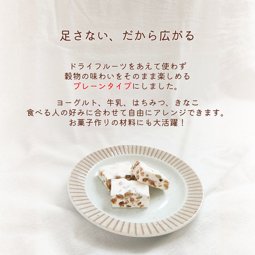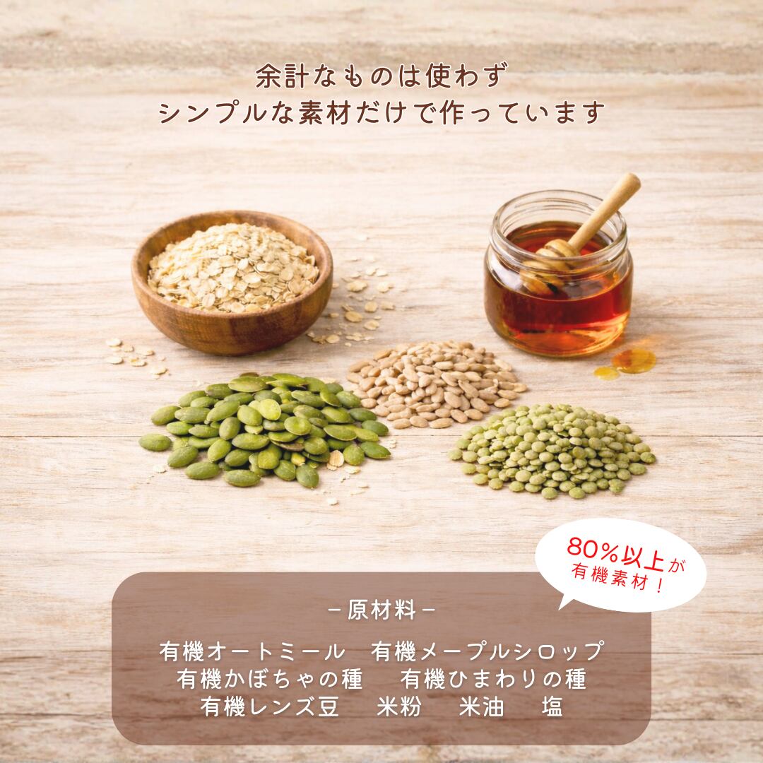 ナッツを使わず、ひまわりの種・かぼちゃの種・レンズ豆などの自然素材で“香ばしさ”と“食感”を出しました。